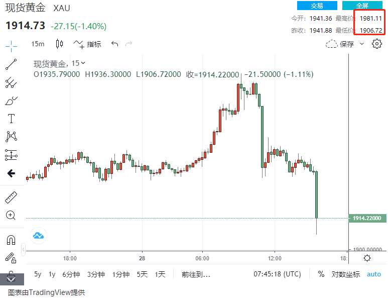 當(dāng)時(shí)現(xiàn)貨黃金5分鐘內(nèi)下跌逾40美元,跌至1935美元下方,較日高回落逾50美元……