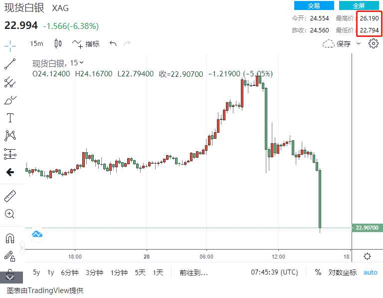 針對白銀走勢,今天亞市現(xiàn)貨白銀一度漲超8%,上破26美元關(guān)口;COMEX期銀漲近6%,逼近26美元/盎司。 隨后也是跟隨金價(jià)出現(xiàn)一波大跳水行情……