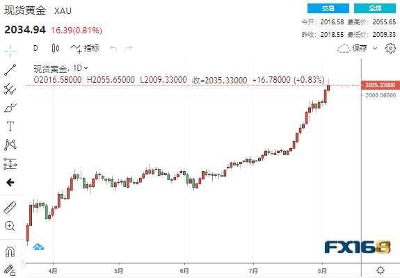 現(xiàn)貨金周二首次突破2000美元大關(guān),并在周三美市盤中創(chuàng)下新高,突破2050美元關(guān)口,最高觸及2055.65美元/盎司,現(xiàn)回落至2034美元/盎司附近交投。