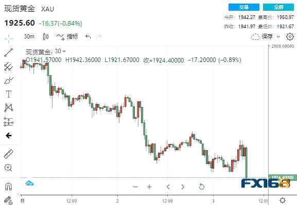 ?。ìF(xiàn)貨黃金30分鐘走勢(shì)圖,來(lái)源:FX168)