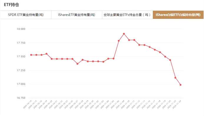 iShares白銀ETF11月24日白銀持有量為16986.38噸,與上一交易日減少127.25噸。