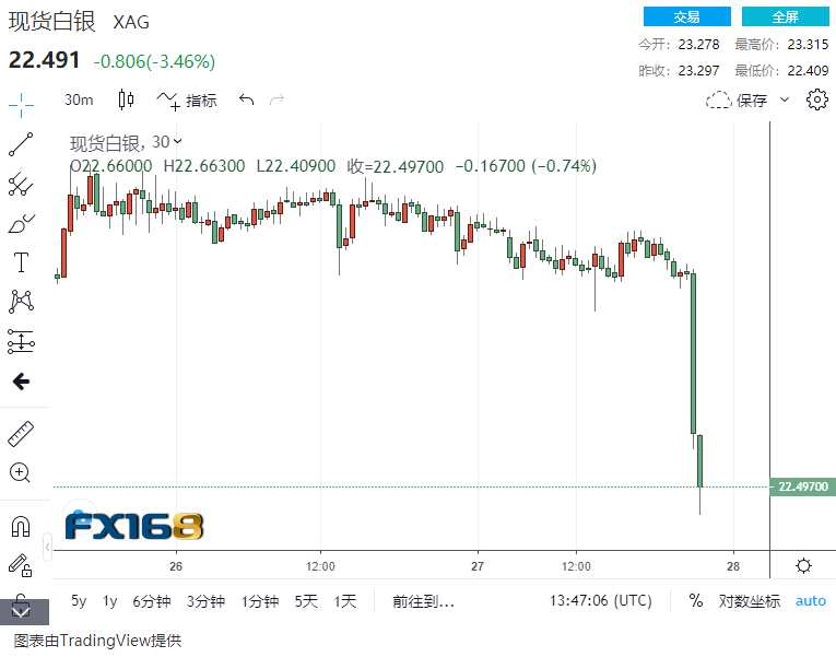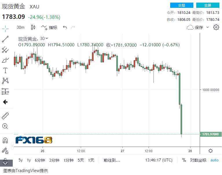 F 周五(11月27日)歐市盤中,香港時(shí)間21時(shí)10分左右,金銀突然遭遇一波殺跌:現(xiàn)貨黃金連續(xù)跌破1800、1790關(guān)口,最低1781.89美元/盎司,逼近1780關(guān)口;現(xiàn)貨白銀跌勢(shì)更為猛烈:最低22.409美元/盎司,跌幅超過(guò)3%……