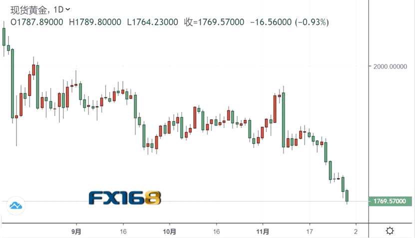 F 周一(11月30日)亞市盤中,現(xiàn)貨黃金短線急跌剛剛失守1770美元,白銀也急跌失守22美元關(guān)口。