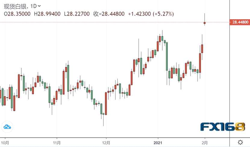 繼上周的暴漲之后,白銀漲勢繼續(xù)!現(xiàn)貨白銀開盤跳漲6%,最高觸及29美元/盎司,創(chuàng)去年8月11日以來新高。此前reddit論壇WallStreetBets散戶號召“發(fā)動史上最大的白銀逼空”。