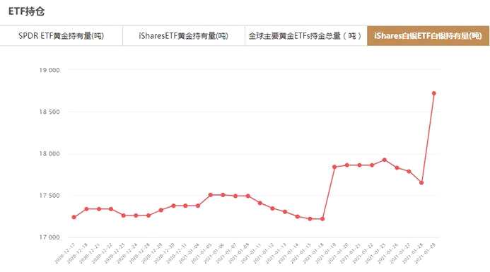 iShares白銀ETF1月29日白銀持有量為18722.33噸,與上一交易日增加1070.56噸。