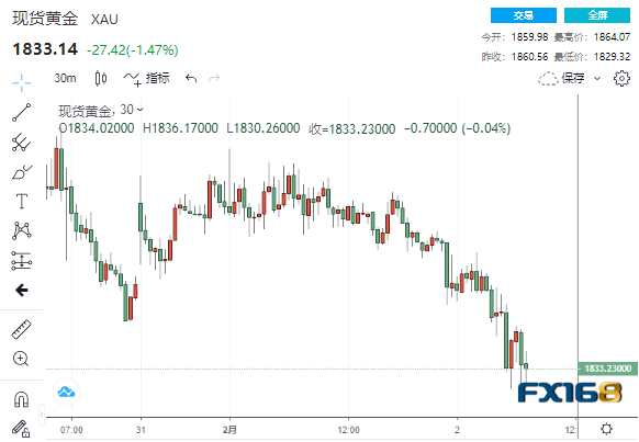 與此同時,現(xiàn)貨金一度下跌1.5%,至1829.32美元/盎司低點,較日高跌去近35美元。