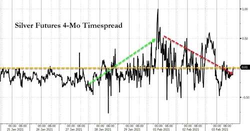 從那以后,市場已經(jīng)恢復(fù)正常,到2月2日收盤時,白銀4個月的套期圖利又回到了負值區(qū)域。