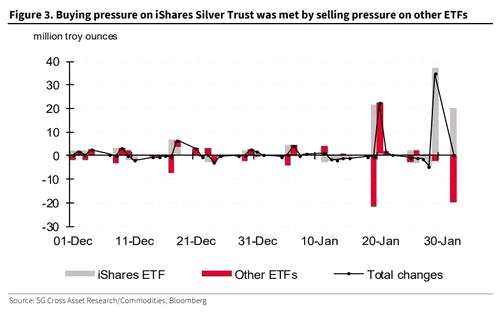 法國興業(yè)銀行商品研究小組的報告監(jiān)測了流入該目標ETF和其他主要白銀ETF和基金的資金,與直覺相反,他們發(fā)現(xiàn),iShares Silver Trust ETF和其他白銀ETF和基金都在1月28日反彈的第一天出現(xiàn)了資金外流。