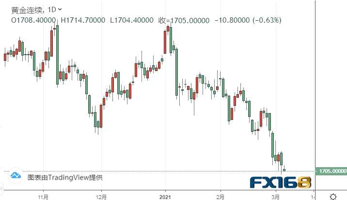 由于美國國債收益率上升和美元走強(qiáng)打擊了黃金的吸引力,金價(jià)周三大跌。COMEX 4月黃金期貨收跌1.0%,報(bào)1715.80美元/盎司,創(chuàng)下約9個(gè)月收盤新低。