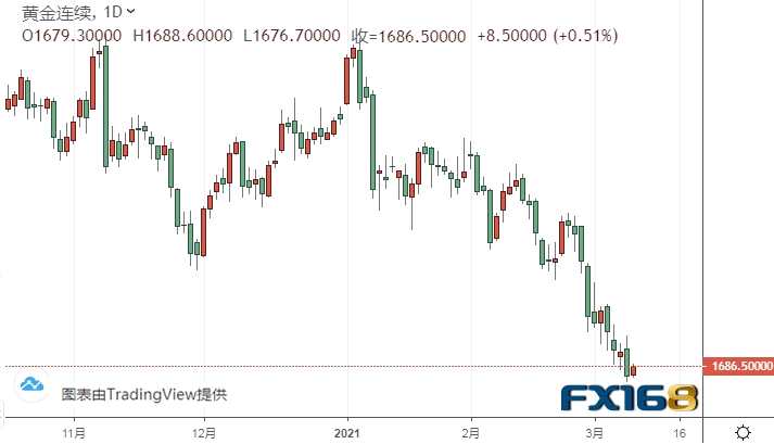 因美元和美國國債收益率持續(xù)走高,金價周一下跌逾1%。COMEX 4月黃金期貨收于1678.00美元/盎司,跌幅1.2%。