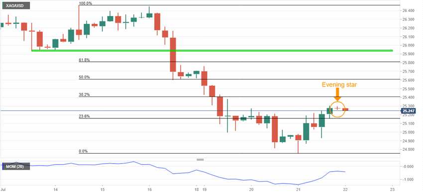 與此同時(shí),復(fù)蘇走勢(shì)需要保持在25.30美元以上,才能對(duì)抗看跌燭臺(tái),并瞄準(zhǔn)7月14日至21日下行的50%斐波那契回撤位,接近25.60美元。