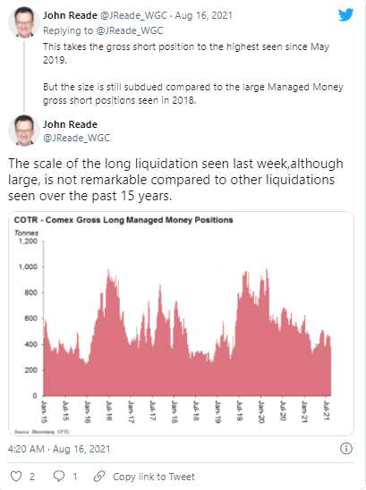 世界黃金協(xié)會首席黃金策略師John Reade在推特上發(fā)表評論說,空頭頭寸升至2019年5月以來的最高水平。