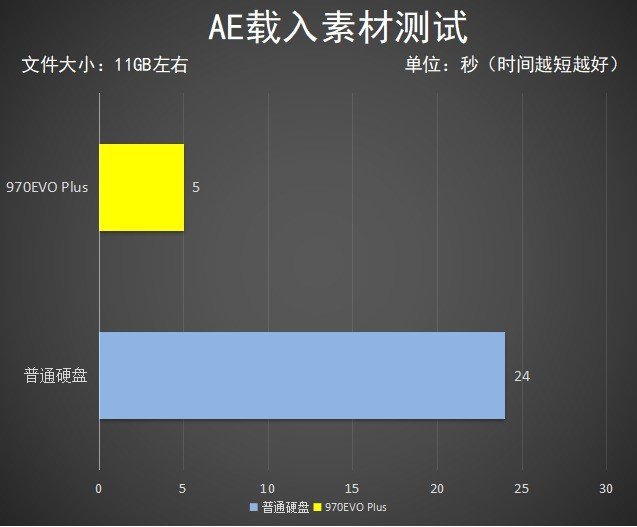 后期視頻剪輯人員除了剪輯軟件之外,還需要使用特效軟件。在AE中,載入素材環(huán)節(jié),普通硬盤需要花費24秒左右,而970EVO Plus僅需要5秒。