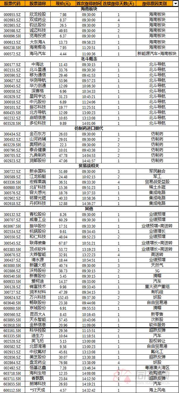 盤(pán)面上,北斗地圖APP將于5月1日上線(xiàn),衛(wèi)星導(dǎo)航概念股掀起漲停潮,中海達(dá)(300177) (300177)、華測(cè)導(dǎo)航(300627)(300627)、移為通信(300590)(300590)、北斗星通(002151) (002151)和華力創(chuàng)通(300045) (300045)等9股漲停。博鰲亞洲論壇2018年年會(huì)將于4月8日至11日在海南博鰲舉行,海南板塊大漲,大東海A(000613) (000613)、覽海投資(600896)(600896)、鈞達(dá)股份(002865)(002865)、雙成藥業(yè)(002693) (002693)、海南椰島(600238) (600238)、海馬汽車(chē)(000572) (000572)7股漲停。