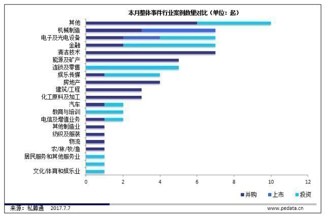 截止本周五下午,共發(fā)生58起投資事件,披露投資金額事件56起,共計353.29億元人民幣。本周涉及金額較大的投資事件發(fā)生在電信及增值業(yè)務(wù)行業(yè),2017年7月6日,阿里資本、弘毅投資、中信產(chǎn)業(yè)投資基金管理有限公司、北京小桔科技有限公司、數(shù)字天空技術(shù)投資集團投資北京三鼎網(wǎng)絡(luò)科技有限公司7億美元。