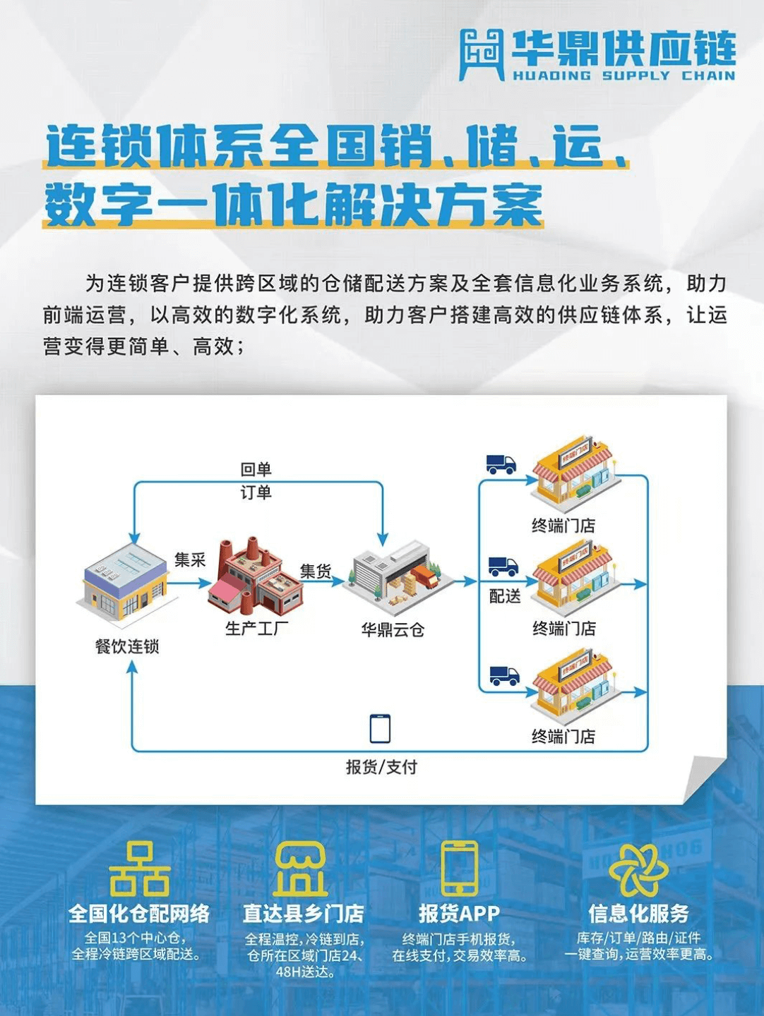 擁有超100000家連鎖餐飲終端門店服務(wù)經(jīng)驗(yàn)的華鼎供應(yīng)鏈,基于對客戶痛點(diǎn)的深度洞察,致力于通過科技賦能解決餐飲品牌發(fā)展過程中關(guān)于供應(yīng)鏈的效率、成本、標(biāo)準(zhǔn)化的問題,提升餐飲供應(yīng)鏈整體運(yùn)營效率。截至目前,華鼎供應(yīng)鏈構(gòu)建的全國化冷鏈物流服務(wù)網(wǎng)絡(luò)和SaaS科技賦能平臺,在高效物流履約保障的基礎(chǔ)上,實(shí)現(xiàn)供應(yīng)鏈整體效率20%以上的提升,讓連鎖餐飲品牌和終端門店通過供應(yīng)鏈賦能,為消費(fèi)者提供更具性價比的產(chǎn)品和服務(wù),在整個餐飲行業(yè)品類和品牌都極度內(nèi)卷階段更具競爭力。