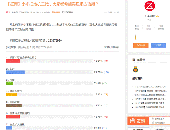而在7月初,小米米家掃地機(jī)器人的研發(fā)團(tuán)隊(duì)石頭科技就在小米社區(qū)發(fā)出公告公開(kāi)調(diào)研“小米掃地機(jī)二代,大家都希望實(shí)現(xiàn)哪些功能”,其中一共給了7個(gè)功能選項(xiàng):做薄、安靜、氣旋、攝像頭監(jiān)控、拖地功能、指定地點(diǎn)前往清掃和塵盒加大容量。參與調(diào)查的用戶共357人,其中拖地功能得到了107票,相比其他選項(xiàng)期望值更高。