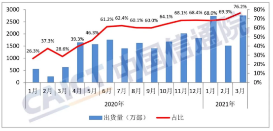 4月12日,中國信通院發(fā)布2021年3月國內(nèi)手機市場運行分析報告。2021年3月,國內(nèi)手機市場總體出貨量3609.4萬部,同比增長65.9%;1-3月,國內(nèi)手機市場總體出貨量累計9797.3萬部,同比增長100.1%。