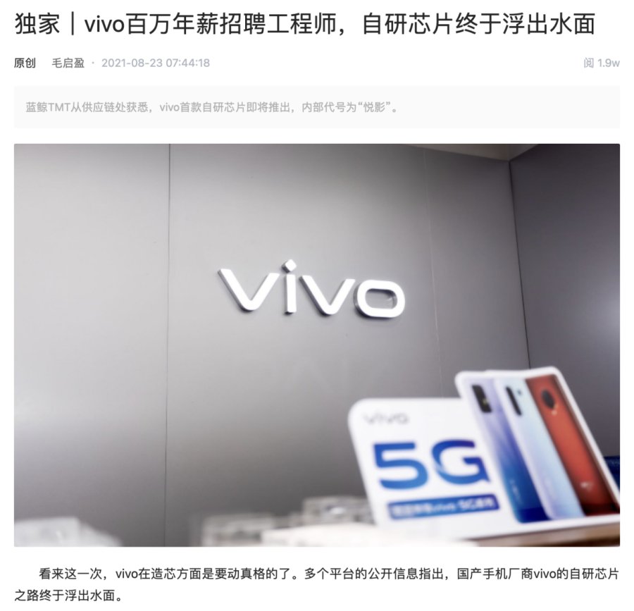 最近幾天,“vivo造芯”的各種信息被媒體接連曝光,坊間對于vivo自研芯片的能力與進(jìn)度也有了一些不同的猜想。從目前爆料的各種信息來看,vivo對芯片制造或許早有布局。早在2019年以前,vivo自研芯片就已經(jīng)在規(guī)劃范圍內(nèi),高薪招聘芯片研發(fā)人才、芯片商標(biāo)注冊、建立專門的芯片研發(fā)中心……大手筆招兵買馬、籌備布局,到逐漸建立起自己的芯片研發(fā)團(tuán)隊,再到最終實現(xiàn)量產(chǎn),vivo一步步展現(xiàn)其在芯片研發(fā)領(lǐng)域所具備的實力與決心。
