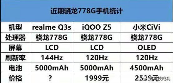 在電池容量方面,iQOO Z5做到5000mAh,realme Q3s被爆料電池容量同樣是做到5000mAh,而同樣搭載高通驍龍778G處理器的小米Civi則只做到4500mAh,差500mAh的差距還是不小的(這話是某品牌高管說過的)。