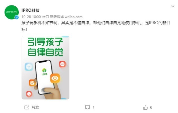 IPRO是中國(guó)手機(jī)品牌,官方從10月底一直在預(yù)熱一款可以培養(yǎng)孩子自覺(jué)的學(xué)生手機(jī)。官方微博精準(zhǔn)的提出了目前父母所面臨的幾大痛點(diǎn),比如“孩子沉迷游戲”、“長(zhǎng)時(shí)間看手機(jī)影響視力、“孩子網(wǎng)絡(luò)交友不慎”等等。對(duì)此,IPRO提出了解決方法與目標(biāo):幫助孩子自律、自覺(jué)地使用手機(jī)。