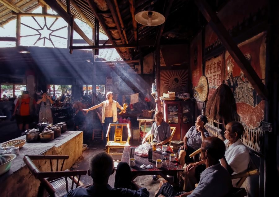 不同于前兩幅作品中人與大自然的緊密結(jié)合,攝影師艾加憲的《茶館時(shí)光》將目光望向了巴蜀文化的重要支點(diǎn)——茶館。清晨溫潤的光線,將這座茶館暗調(diào)、斑駁、陳舊的堂鋪照得亮亮堂堂。中央起范兒唱戲的大爺選擇了一個(gè)最佳位置,整個(gè)人沐浴在陽光下。老茶客們捧著一元一杯的花茶,聽著四川鄉(xiāng)音獨(dú)有的迂回曲調(diào),沉浸在溫暖與舒適當(dāng)中,享受簡單巴適的生活樂趣。