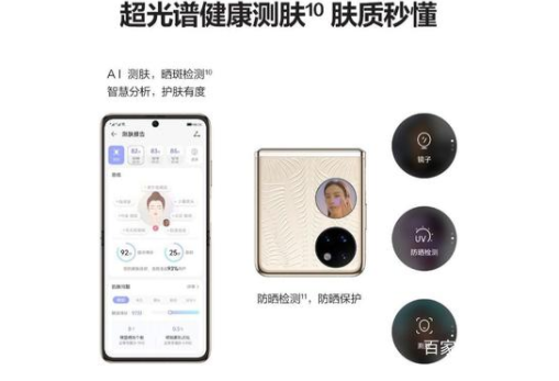 華為P50 Pocket利用外側相機鏡頭模塊中的超光譜傳感器,支持智能防曬檢測,全天候提供防曬提醒、卸妝檢測。
