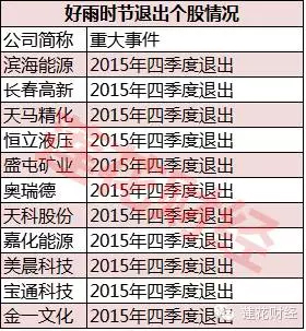 據(jù)2015年三季報(bào)和年報(bào)顯示,“時(shí)節(jié)好雨”退出了濱海能源、長(zhǎng)春高新、天馬精化等11家公司前十大流通股東名單。