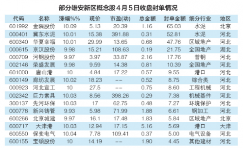 4月25日9點25分集合競價一出來,共有包括金隅股份、京漢股份、河鋼股份等16只雄安新區(qū)概念股漲停,且封單超過10億元,其中,金隅股份、華夏幸福以及冀東水泥,封單均超100億元。