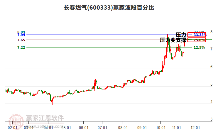 我們對長春燃?xì)鈧€股進(jìn)行波段百分比分析:短期處于上漲走勢,當(dāng)下該股突破波段百分比工具所顯示的7.65元,如此線支撐不破,上方壓力關(guān)注7.94元。