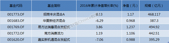 招商豐慶混合A策略最為保守,截至2016年四季度末,股票市值僅占基金凈值的17.30%,易方達(dá)瑞惠和南方消費(fèi)活力持股倉位分別是20.76%和43.68%。而收益為負(fù)的華夏新經(jīng)濟(jì)、嘉實(shí)新機(jī)遇的風(fēng)格則相對激進(jìn),華夏新經(jīng)濟(jì)股票持倉最高。