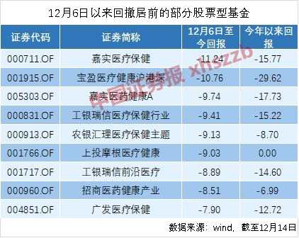 重倉股的下跌自然令相關(guān)基金凈值大幅回撤。數(shù)據(jù)顯示,12月6日以來,股票型基金中醫(yī)藥方面的基金凈值回撤居前。在不到兩周時(shí)間內(nèi),部分基金凈值回撤超過10%,嘉實(shí)醫(yī)療保健凈值回報(bào)為-11.24%,寶盈醫(yī)療健康滬港深凈值回報(bào)為-10.76%。上投摩根醫(yī)療健康在12月5日收盤時(shí)年內(nèi)回報(bào)尚有9.93%,但也在最近的下跌中抹去了全年漲幅。