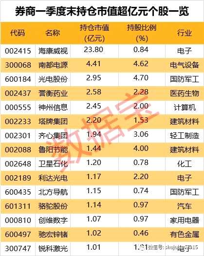 從持股市值來看,券商持股市值過億元的個股有15只,其中??低暢止墒兄底罡?,為23.8億元;其次是南都電源,持股市值為4.41億元。此外,光電股份、譽(yù)衡藥業(yè)、神州信息、塔牌集團(tuán)4股持股市值均超2億元。