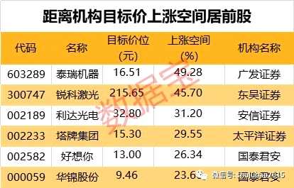 數(shù)據(jù)寶統(tǒng)計顯示,上述券商新進(jìn)增持的17只個股中,有10股近一個月獲機(jī)構(gòu)關(guān)注。按昨日收盤價計算,泰瑞機(jī)器、銳科激光、利達(dá)光電3股距機(jī)構(gòu)目標(biāo)價上漲空間超30%。
