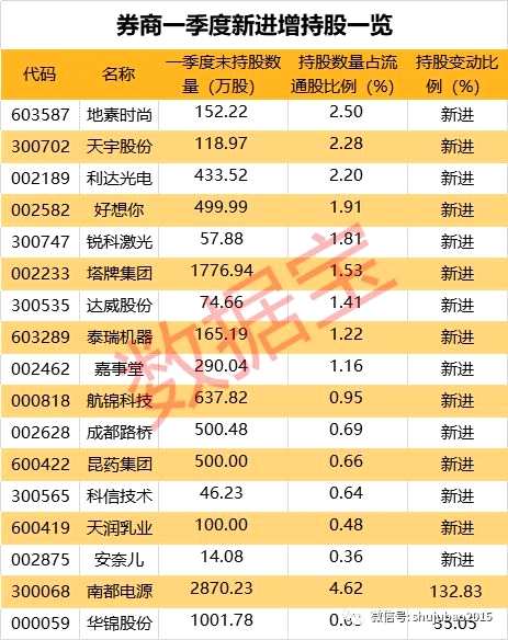 數(shù)據(jù)寶統(tǒng)計顯示,截至最新,券商一季度新進(jìn)15股,增持2股。券商一季度增持的個股分別為南都電源和華錦股份。從持股變動比例來看,上述2股持股變動比例均超30%。