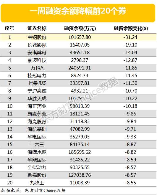 與此同時,融資余額降幅最大的是寶鋼股份,降幅達31.24%。以下是上周融資余額降幅最大的20只個券: