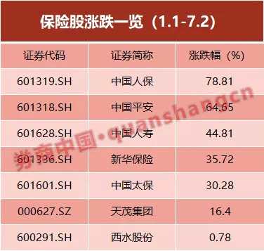 這一區(qū)間保險股整體漲勢亦較好,保險指數(shù)整體上漲12.66%。2019年初至7月2日,上證綜指累計上漲22.06%,深證成指累計上漲31.85%,保險指數(shù)累計上漲57.77%,大幅跑贏大盤。其中【中國人保(601319)、股吧】和中國平安分別累計上漲達到78.81%和64.65%。