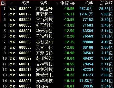科創(chuàng)板股票普遍下跌,中國通號跌逾16%,跌幅居首。