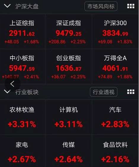 27日上午收盤(pán),上證指數(shù)上漲1.68%,報(bào)收2911.62點(diǎn),北上資金凈流入逾60億元,行業(yè)板塊全線(xiàn)飄紅。