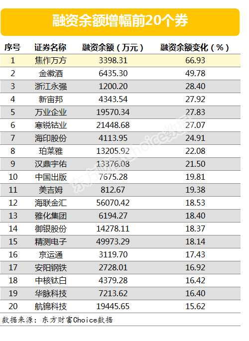 融資余額增幅最大的是焦作萬方,該股最新融資余額3398.31萬元,較前一交易日增長66.93%。另外,融資余額增幅較大的還有金微酒、浙江永強(qiáng)等,融資余額分別增長49.78%、28.40%。