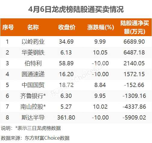 陸股通參與龍虎榜中個(gè)股共涉及8股,其中4股被陸股通凈買入,以嶺藥業(yè)被買入最多,為6689.9萬元。另外4股被陸股通凈賣出,斯達(dá)半導(dǎo)被賣出最多,為5909.02萬元。