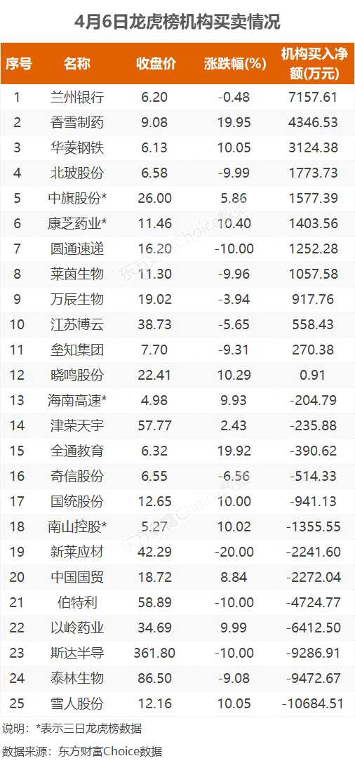 機(jī)構(gòu)參與龍虎榜中個(gè)股共涉及25股,其中12股被機(jī)構(gòu)凈買入,【蘭州銀行(001227)、股吧】被買入最多,為7157.61萬元。另外13股被機(jī)構(gòu)凈賣出,雪人股份被賣出最多,為1.07億元。