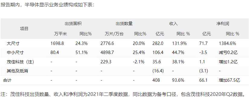 據(jù)悉,TCL能夠全面超額完成預(yù)算,主要受益于公司半導(dǎo)體光伏及半導(dǎo)體業(yè)務(wù)收入和利潤同比大幅增長,上半年公司半導(dǎo)體顯示業(yè)務(wù)實(shí)現(xiàn)營業(yè)收入408億元,同口徑同比增長93.6%,凈利潤66.1億元,同比增長67.5億元。