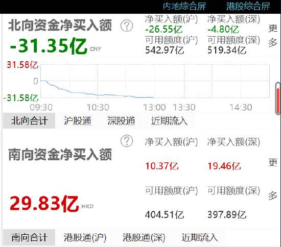 午評(píng):北向資金凈流出31.35億元 滬股通凈流出26.55億元