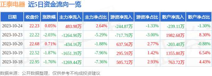 摘要: 消息,截至2023年10月24日收盤,正泰電器(601877)報收于22.23元,上漲0.05%,換手率0.39%,成交量8.3萬手,成交額1.84億元。10月24日的資金流向數(shù)據(jù)方面,