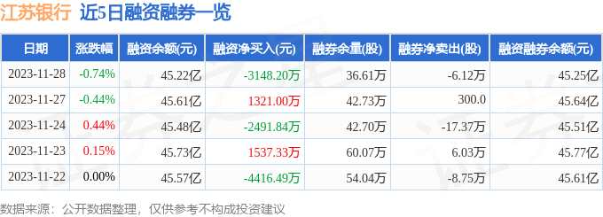 江蘇銀行融資融券信息顯示,融資方面,當日融資買入9568.6萬元,融資償還1.27億元,融資凈償還3148.2萬元。融券方面,融券賣出7500.0股,融券償還6.87萬股,融券余量36.61萬股,融券余額246.02萬元。融資融券余額45.25億元。近5日融資融券數(shù)據(jù)一覽見下表: