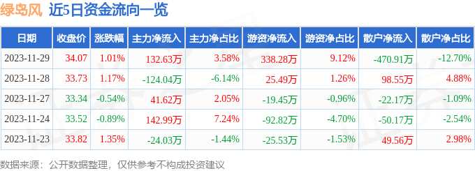 摘要: 消息,截至2023年11月29日收盤,綠島風(fēng)(301043)報收于34.07元,上漲1.01%,換手率6.02%,成交量1.08萬手,成交額3709.31萬元。11月29日的資金流向數(shù)據(jù)方面,