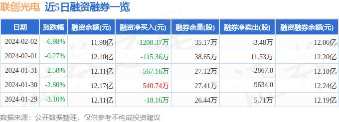 聯(lián)創(chuàng)光電融資融券信息顯示,融資方面,當(dāng)日融資買入2053.67萬元,融資償還3262.05萬元,融資凈償還1208.37萬元。融券方面,融券賣出9.44萬股,融券償還12.92萬股,融券余量35.17萬股,融券余額838.69萬元。融資融券余額12.06億元。近5日融資融券數(shù)據(jù)一覽見下表: