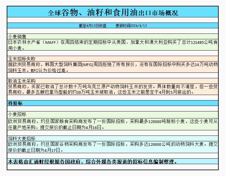 截至周四收盤,全球谷物、油籽和食用油出口市場招標(biāo)、采購概況