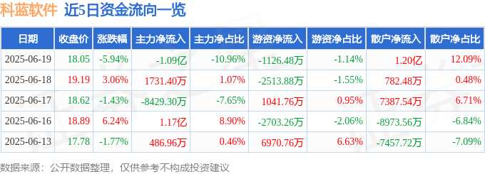 消息,截至2025年6月19日收盤,科藍軟件(300663)報收于18.05元,下跌5.94%,換手率12.21%,成交量53.9萬手,成交額9.91億元。